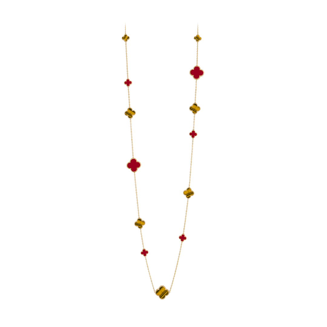Van Cleef & Arpels Magic Alhambra Long Necklace 16 Motifs Carnelian and Tiger Eye 18K Yellow Gold