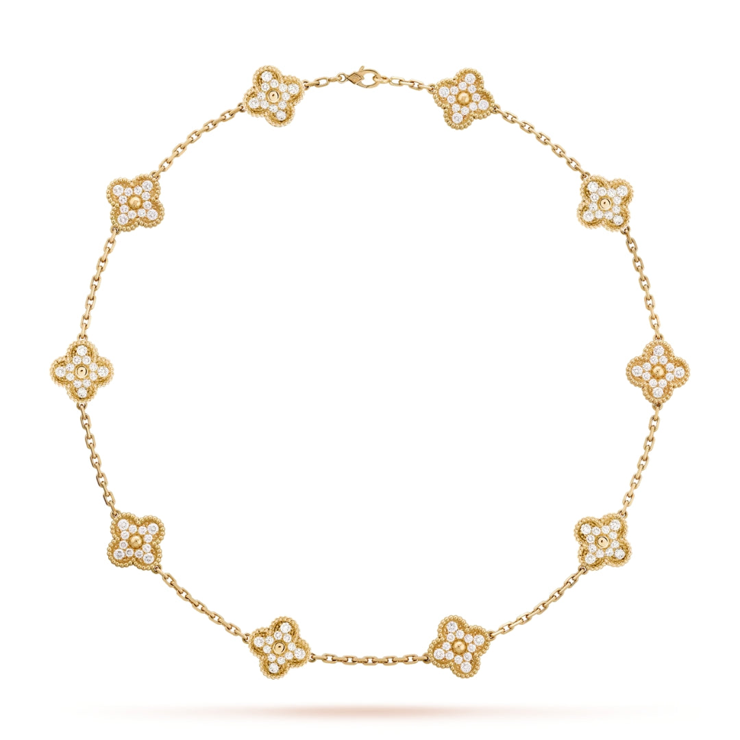 This Van Cleef & Arpels Vintage Alhambra Necklace 10 Motifs Full Diamonds 18K Yellow Gold is made up of solid 18K Yellow Gold & 120 Natural VS1 Stones being 4.83cts.